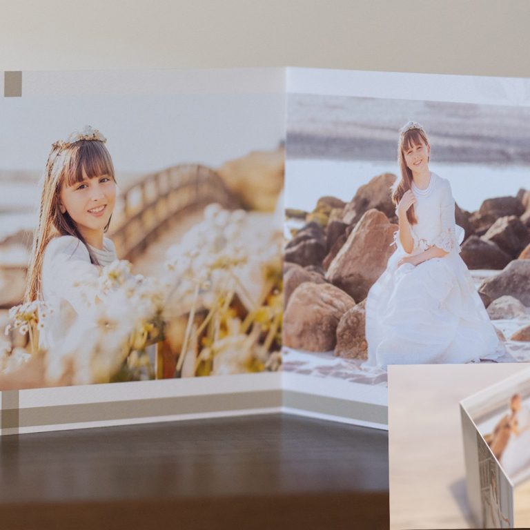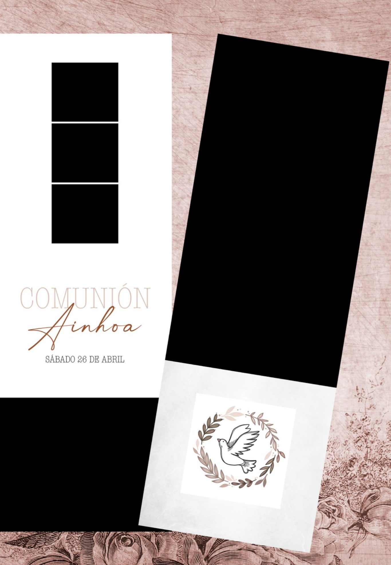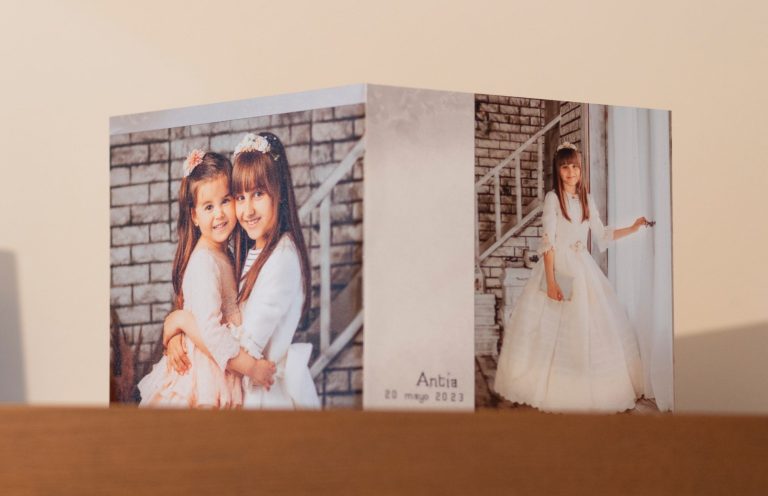 Este recordatorio consta de 4 fotos impreso en papel Silk, con un hendido en la parte central y una hoja Gross en el medio que le da consistencia. Entre las ventajas de este formato encontramos la versatilidad para combinar diferentes formato verticales, horizontales y cuadrados con total libertad. El tamaño habituales de este recordatorio de de 15x15 cerrado y 15x30 abierto